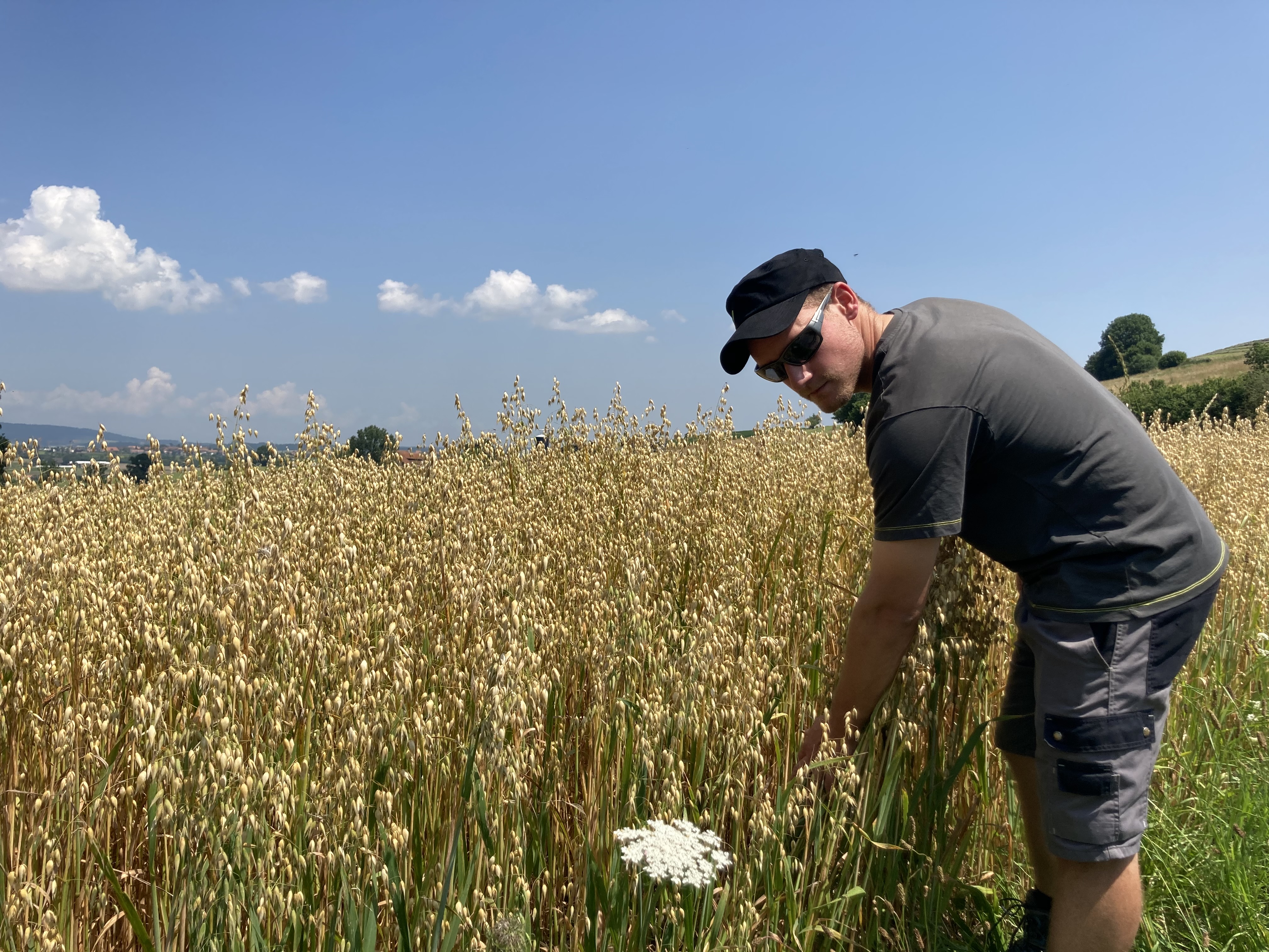 Landwirt Marc Lehmann prüft sein Haferfeld bei Bern